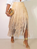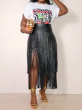 Elevate your style with the Gigi Skirt! This bold, vegan leather piece features a fringe bottom and an asymmetrical design, perfect for making a statement. With a back zip closure and a fit that runs slightly large, we recommend sizing down for the best fit. Professional leather clean only.