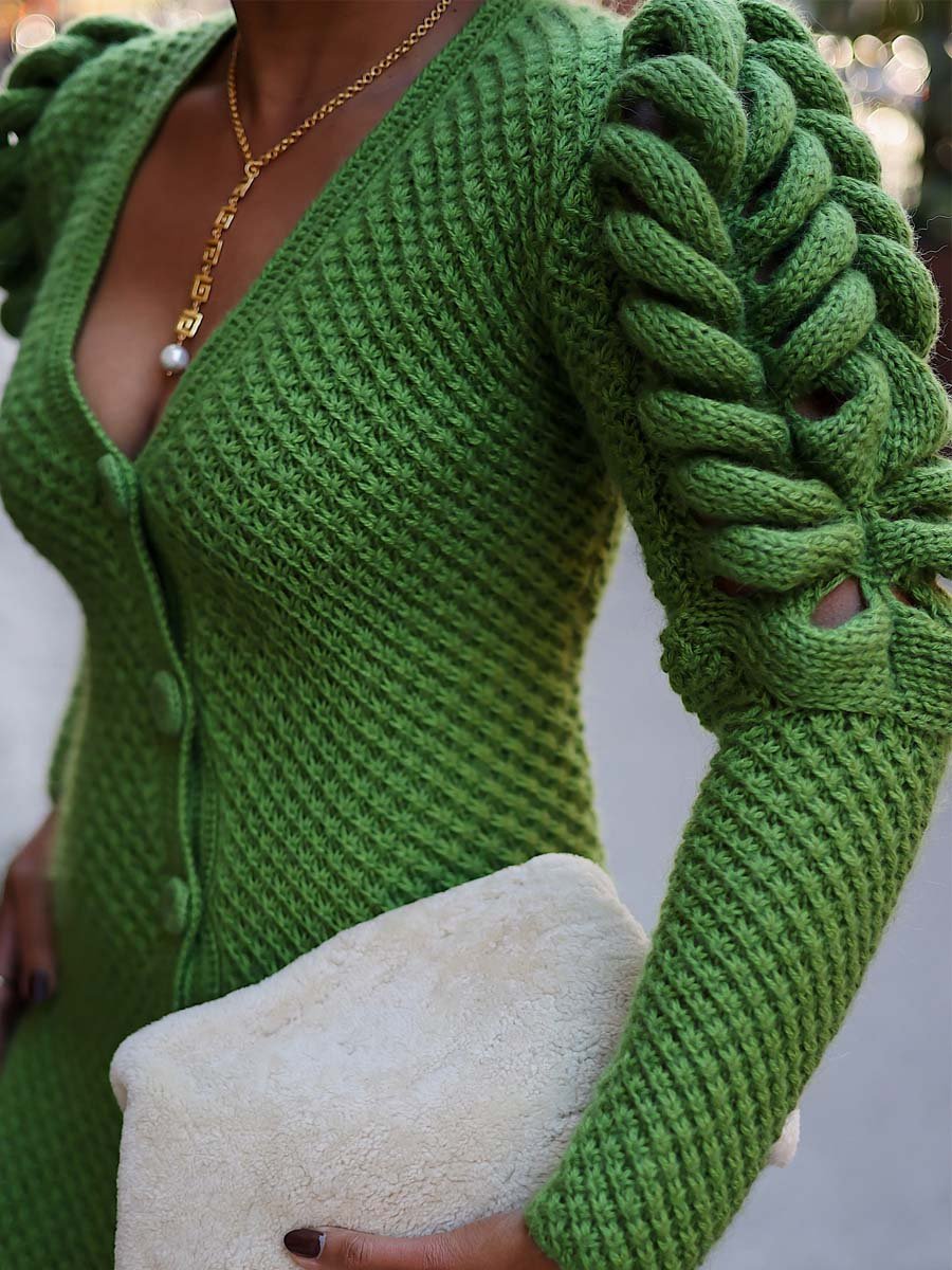 The Statement Sleeves Dress is a bold and sophisticated piece that showcases unique, sculptural sleeves and a form-fitting silhouette. The deep V-neckline and button-down front add a touch of elegance, while the dramatic braided sleeves create a striking visual impact. The dress is finished with a playful fringe hem, adding texture and movement to the design. Perfect for making a statement at any event, this dress blends modern design with timeless charm.