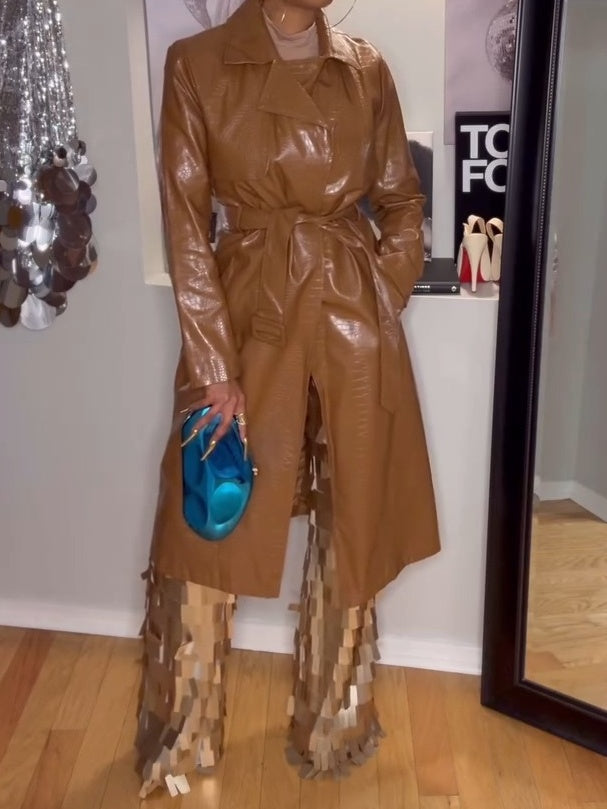 The Valentina Sequin Fringe Trouser is made from a sheer mesh fabrication and features a high rise waist, large, rectangular sequin fringe detailing, a flared leg silhouette, slick, opaque lining, and a tonal side zipper closure.
