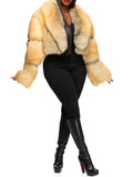 Stay warm, cute, and classy in our golden fur coat. It features two pockets and hook closure. This fur runs large. Order one size down. Model is 5'5'', 160lbs, 36 G bust, 29" waist, 43" hips wearing a size M.