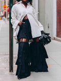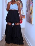 Made with crepe, this piece features a high-waist pants with structured, segmented sections revealing glimpses of skin, and layered with strips of fabrics all over, lending an edgy, avant-garde feel.