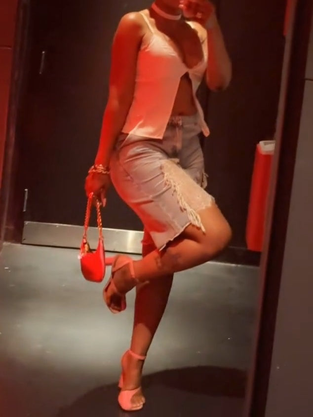Ivory Satin Flyaway Top Lace Detail Denim Jorts