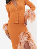 This feathered-cuff top & slit-feathered midi skirt set is bold and beautiful. Her buttons are fully functional and leave plenty of room for multidimensional wear. And top two-tone feathered cuffs for a lot of extra flair. Skirt has a fitted silhouette with asymmetrical line detailing and features a fluffy feather trim that gives the skirt an extra, elevated look.