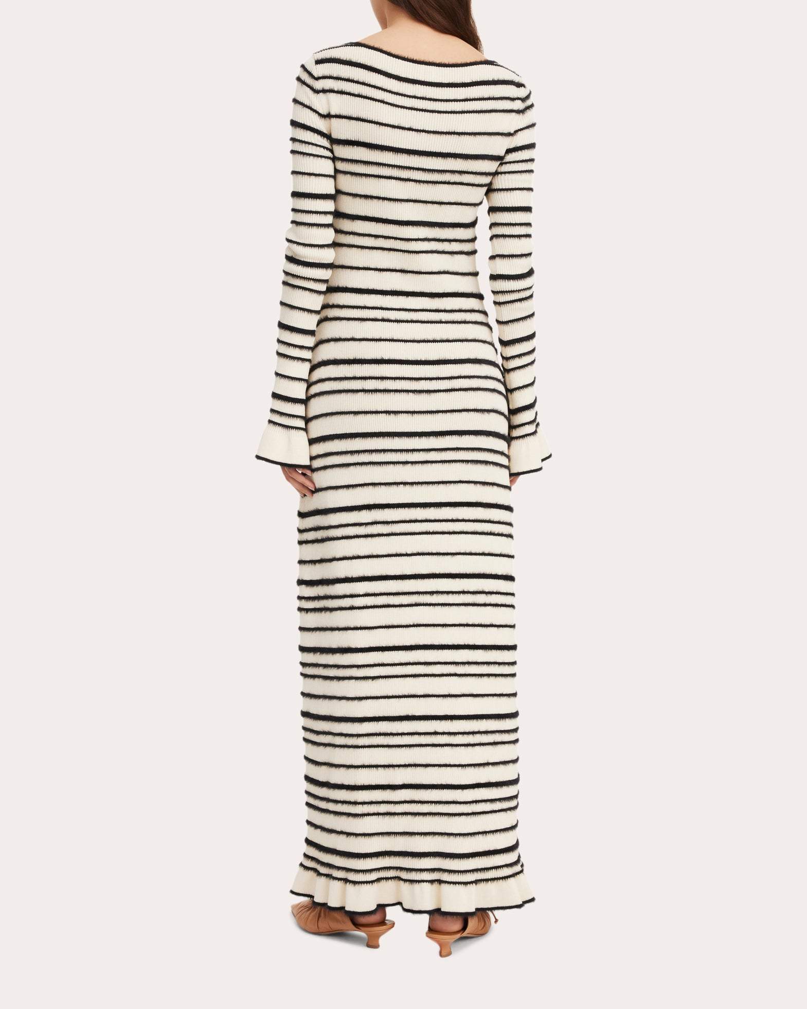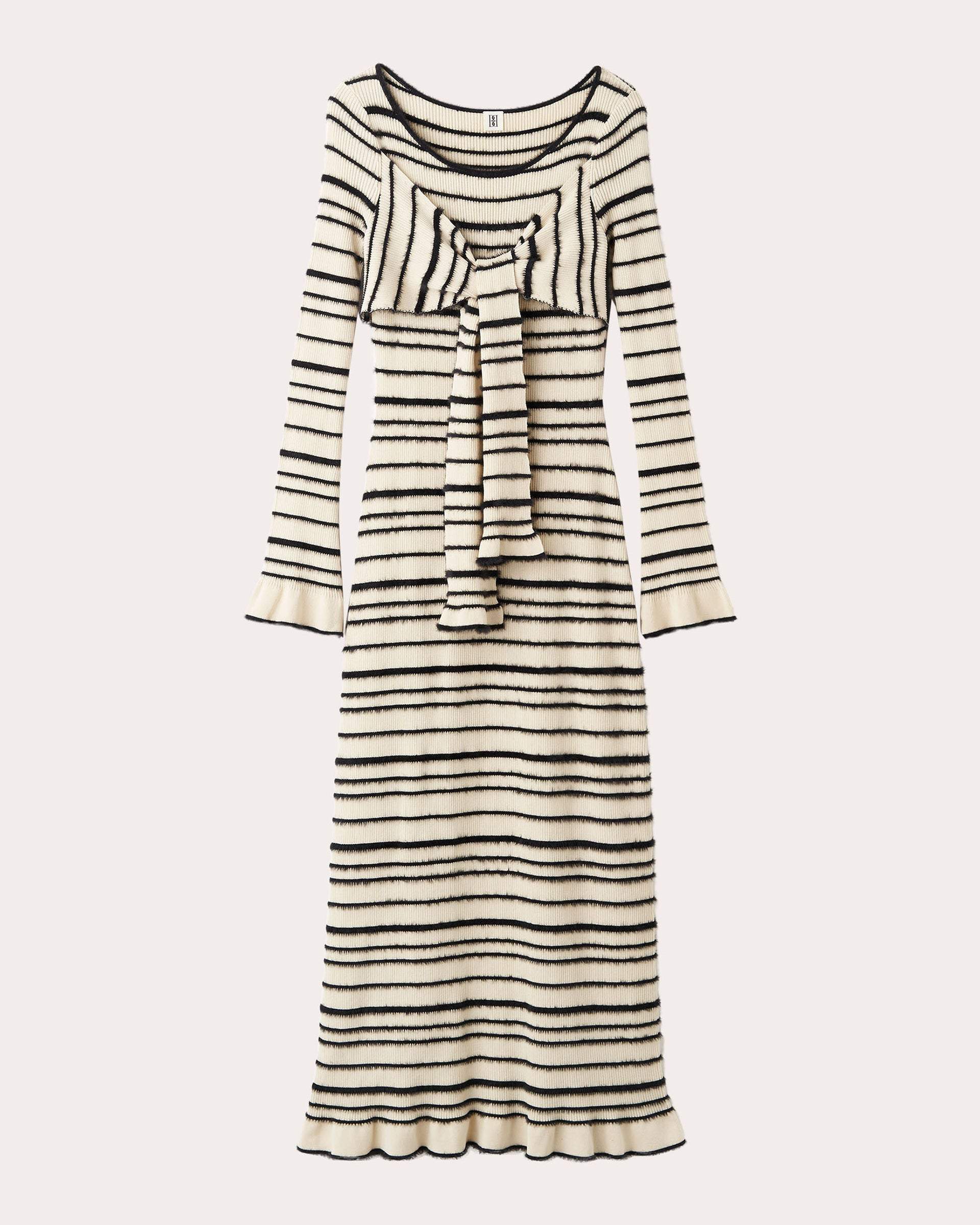 A celebration of form and texture, the dress decorates its ribbed silhouette with plush knit stripes to create soft dimension. A draped front-tie detail and ruffled trim along the hem and sleeve cuffs bring feminine shape to this slim-fitting maxi.