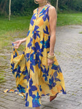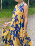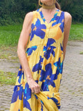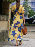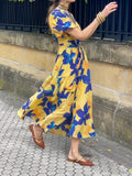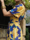 Make a statement in this gorgeous silky yellow with blue flower print maxi dress. Features Balloon sleeves, and a full front button-down closure. Detachable detail waist tie. Model is 5.6” and wearing Small
