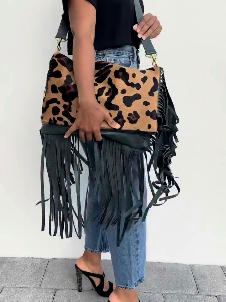 Measurements: Approx. 11 x 14". Fringe is 13.5". Strap shortens to 37 inches & extends to 52 inches.