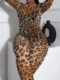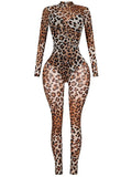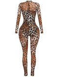 Leopard Print Semi-Sheer Long Sleeve Bodycon Party Jumpsuit