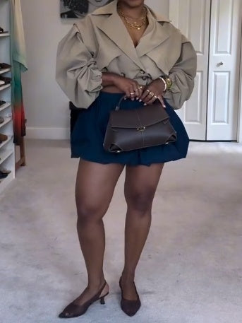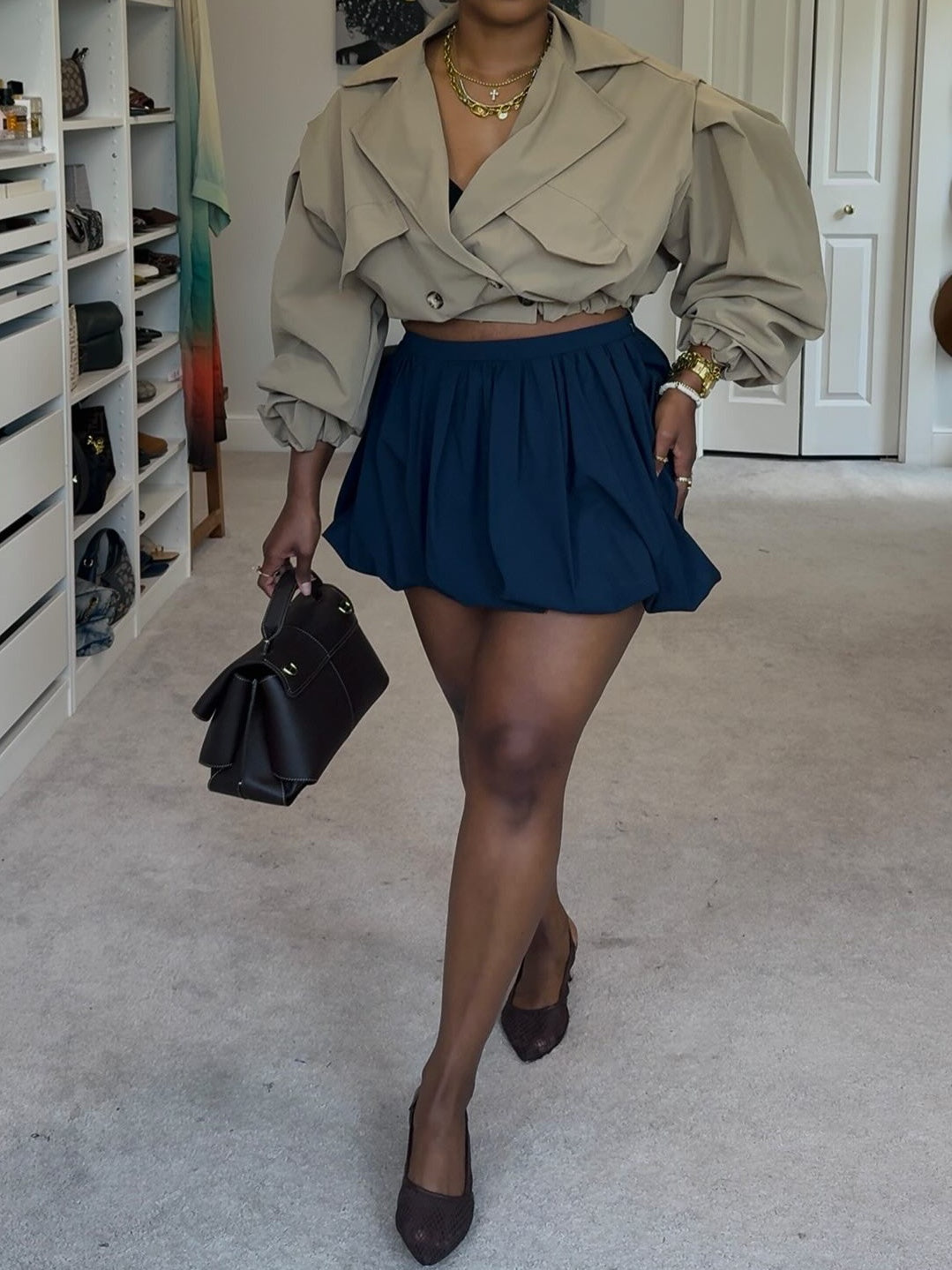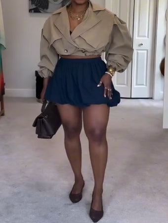Perfect for a chic evening out, doll! Featuring a stone fabric with long sleeves and a cinched waist, this cropped trench coat adds a sleek touch to your wardrobe, blending comfort with style.