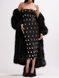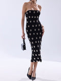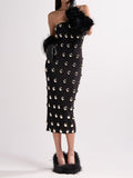 This fierce bodycon is made from a skin-hugging, stretchy fabric and boasts a strapless neckline with inner elastic trim, a concealed side zipper closure, a skin-hugging fit, and a midi-length silhouette. It’s completely adorned in metallic silver-tone hardware throughout.