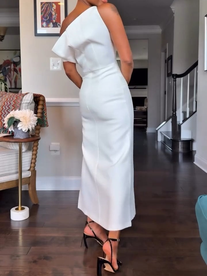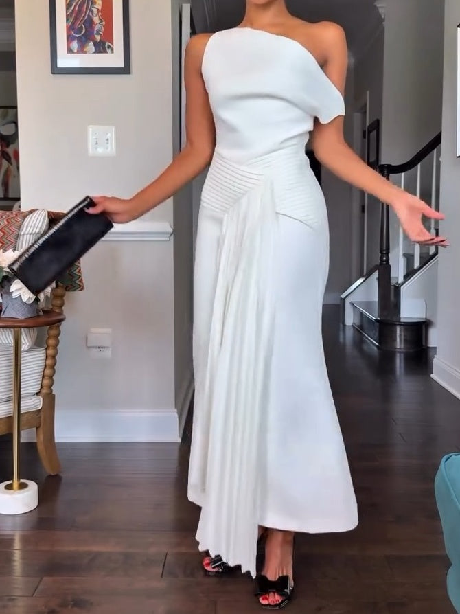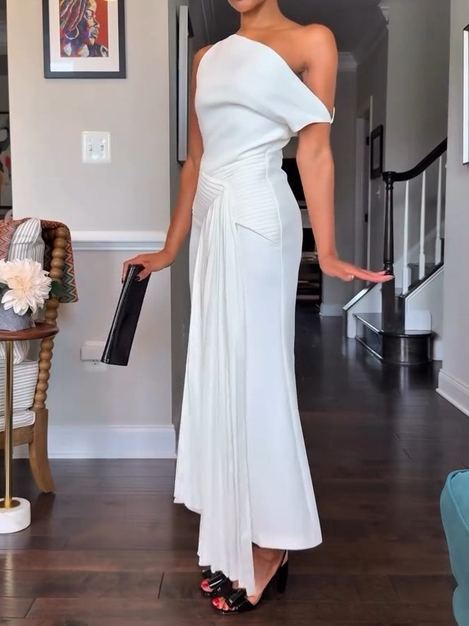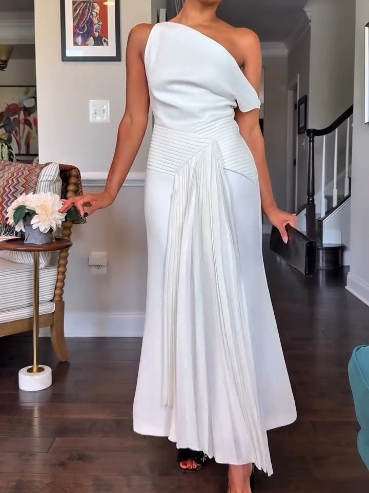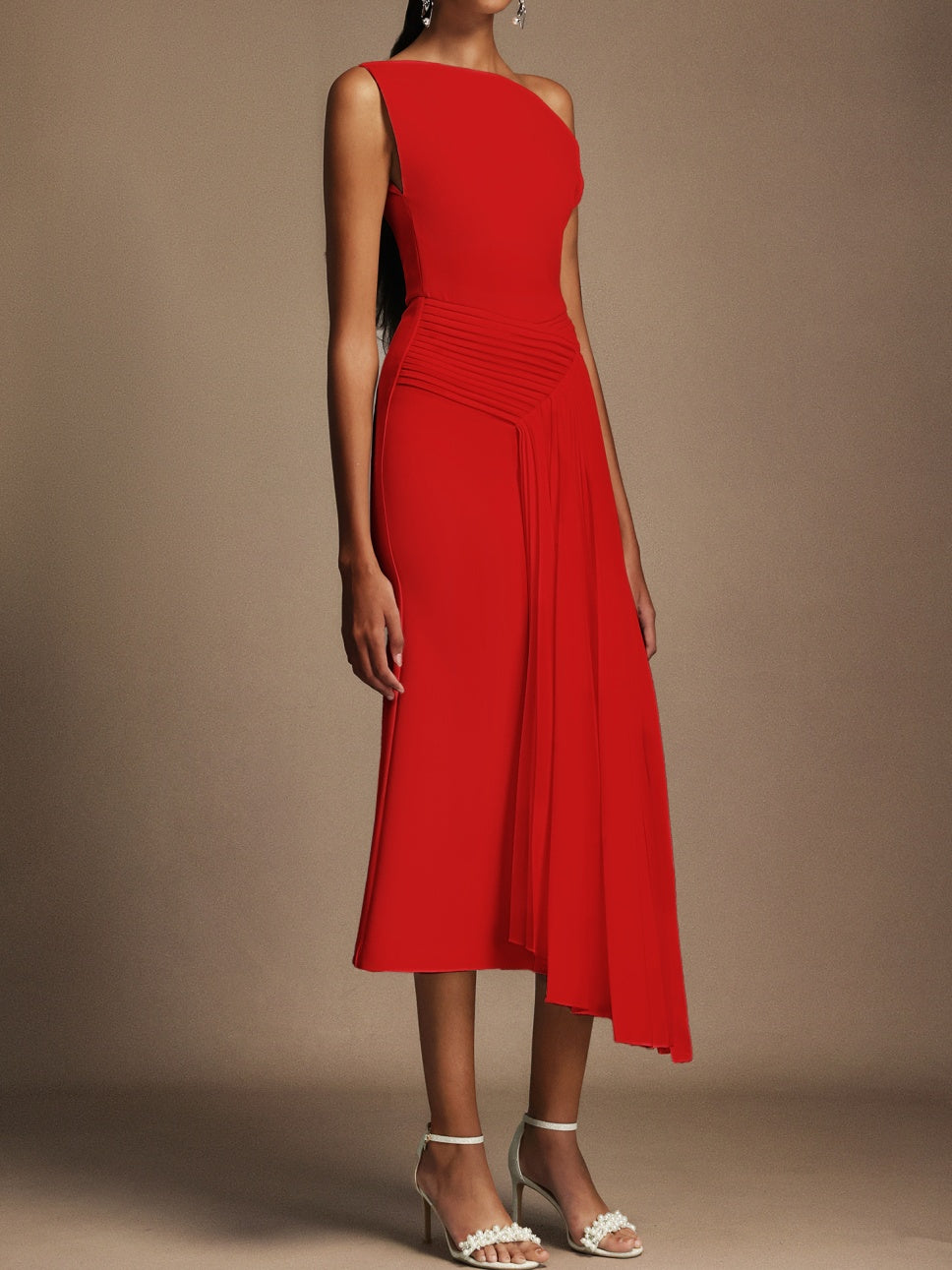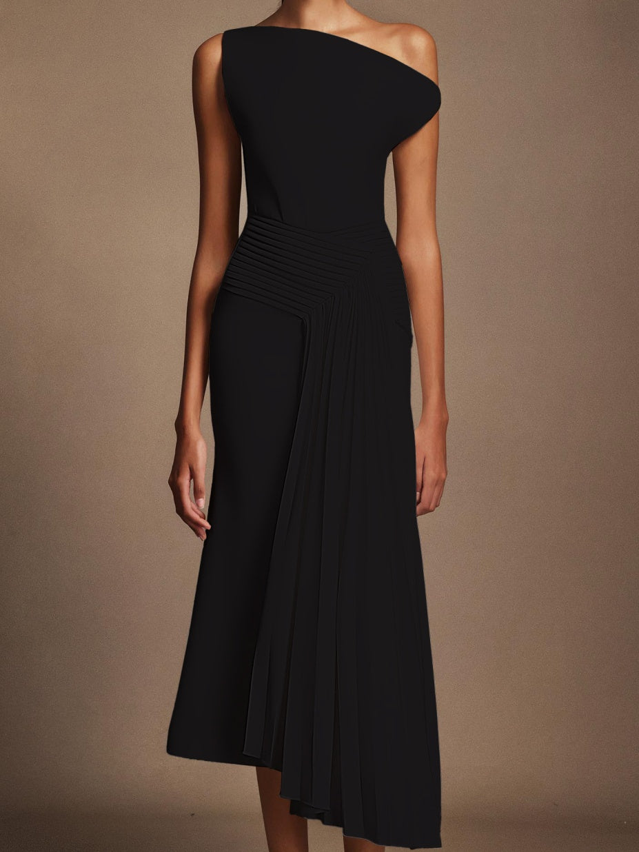 Oblique Shoulder Sleeveless Folds Midi Dress