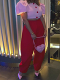 - Design Features: The cropped top features stylish puff sleeves and contrasting buttons, while the wide-leg pants provide a relaxed yet flattering silhouette
