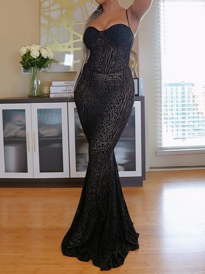 This sultry style is crafted from a double-lined, sheer mesh fabrication and features a tonal multi-print design of cheetah, leopard, and tiger stripes crafted from a luxurious velvet, a sweetheart neckline with padded bust cups, internal structural boning running down the bodice, thin adjustable tank straps, and a concealed back zipper closure. Complete with a sexy, curve-hugging silhouette, and a flowing, floor-grazing train. Pair with platform pumps and a vampy lip for a finished look.