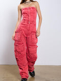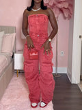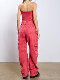 It features shirred elastic backing, a classic five-pocket design, contour seaming, and functional belt loops at the waist. Complete with four cargo flap pockets down each leg, strappy hem detailing, a wide leg silhouette, and a front zip closure with a button down front placket. Style with stacked jewelry and chunky combat boots for a finished look.