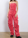 - It features shirred elastic backing, a classic five-pocket design, contour seaming, and functional belt loops at the waist. Complete with four cargo flap pockets down each leg, strappy hem detailing, a wide leg silhouette, and a front zip closure with a button down front placket. Style with stacked jewelry and chunky combat boots for a finished look.