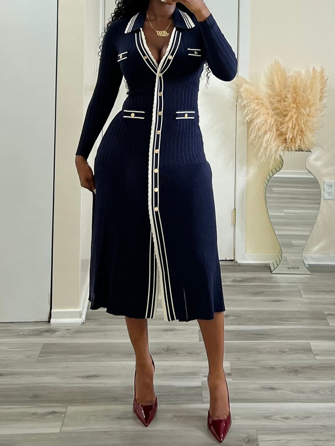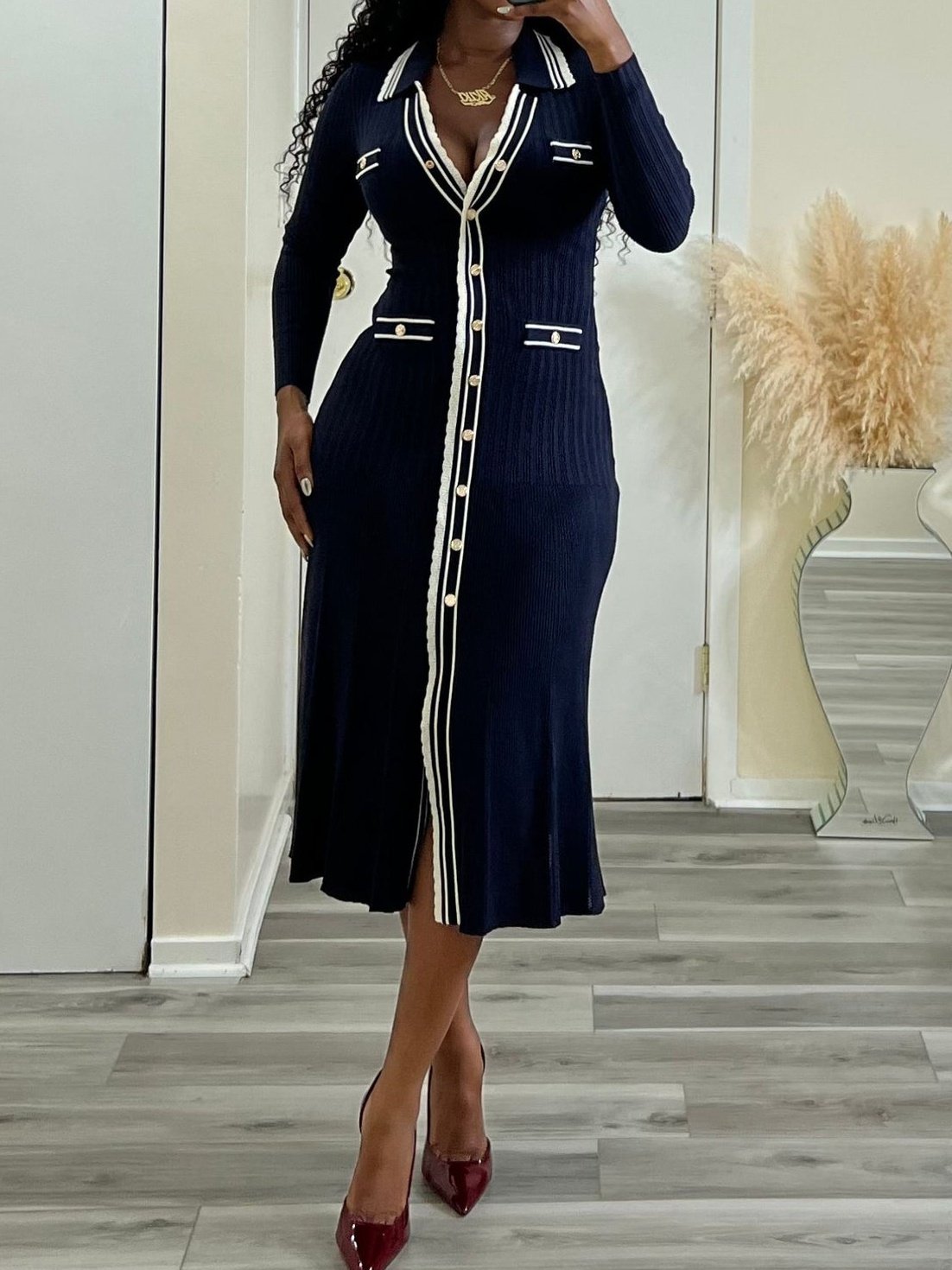 Made with a heavyweight knit and featuring white trim, this ladylike dress is designed to enhance your silhouette. Complete with embossed crest metal buttons for a touch of luxury. Elevate your style and feel confident with this timeless dress.