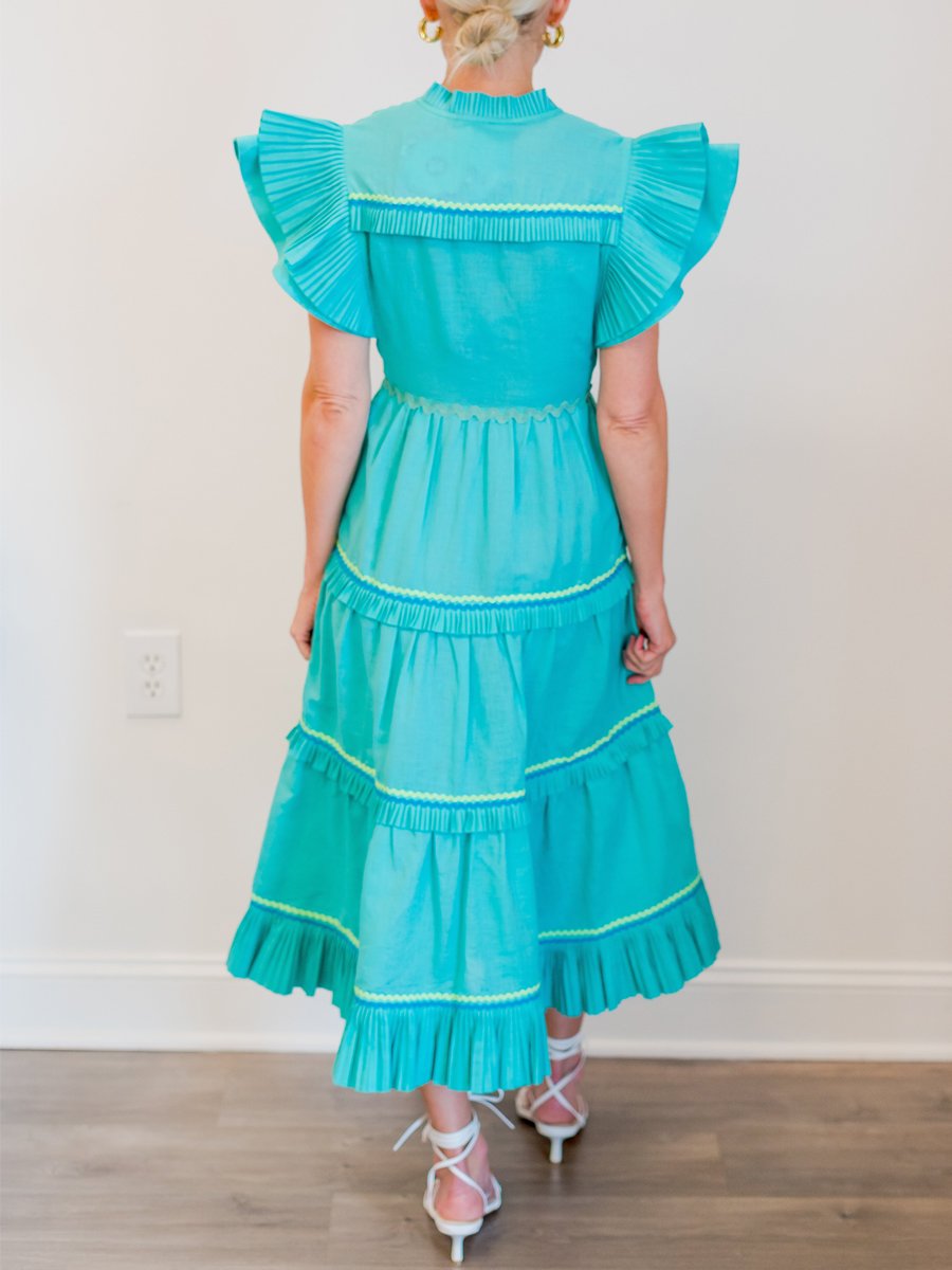 A classic summer staple, this midi, short-sleeved, ruffled blue dress is perfect for any day event. The button down feature and adjustable waist allow you to play with the structure of the dress, so that it's perfect for you!