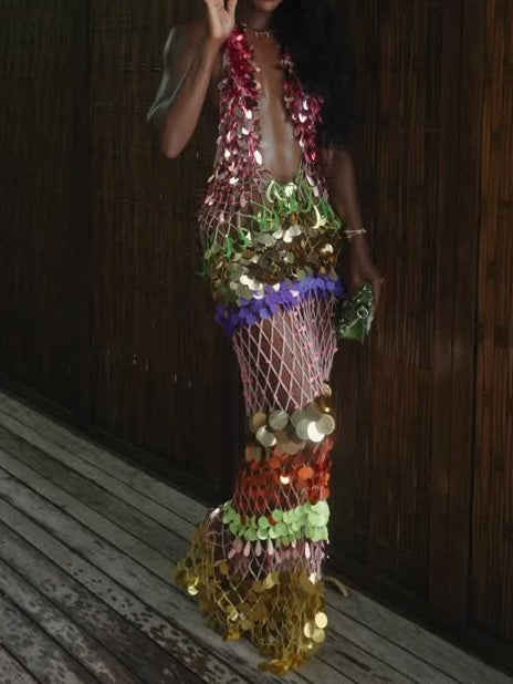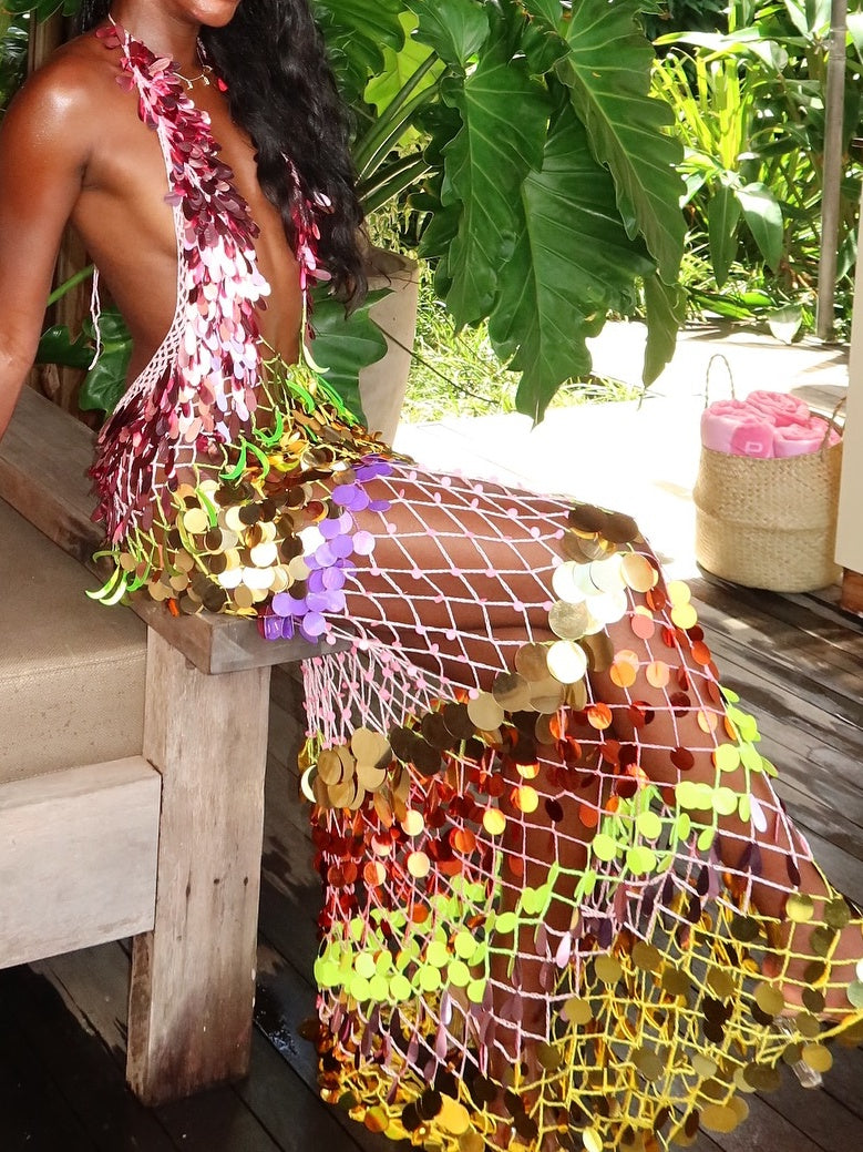 The multi-colored sequin and netted combo, combined with a plunging neck line and Ariana’s waves, are giving total mermaid. And if that’s your summer vibe too it’s lucky for you that this handmade dress looks just as good on land as it does by the water .