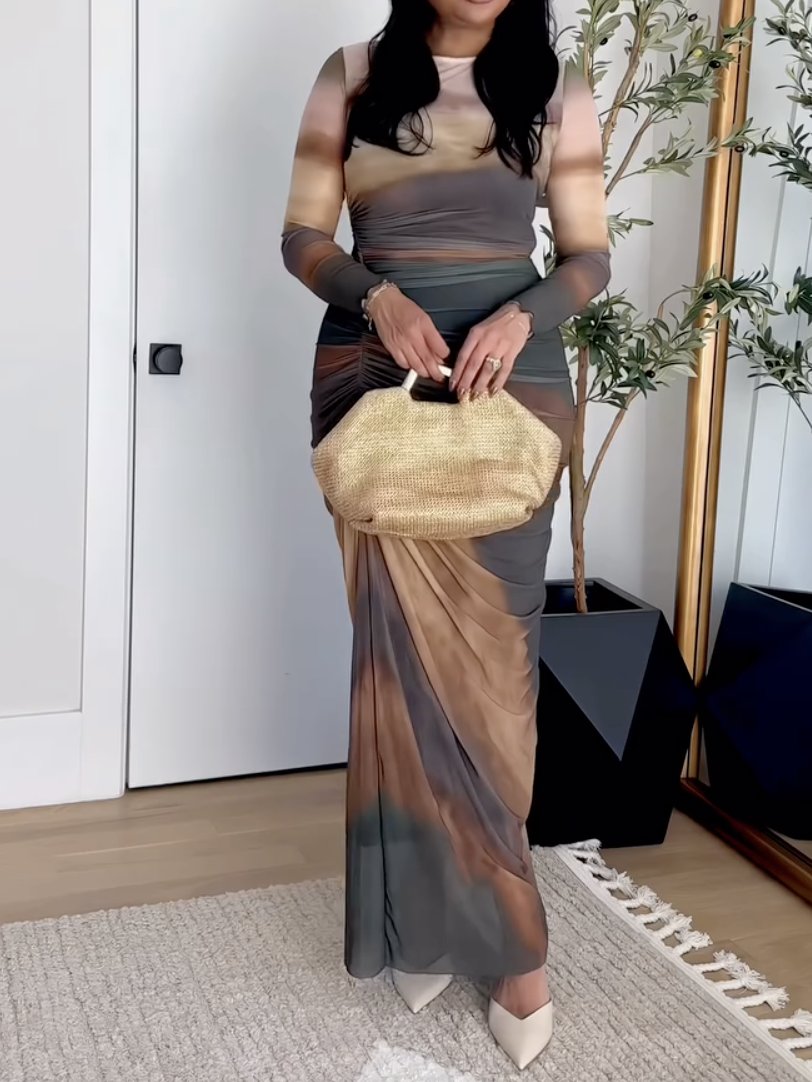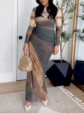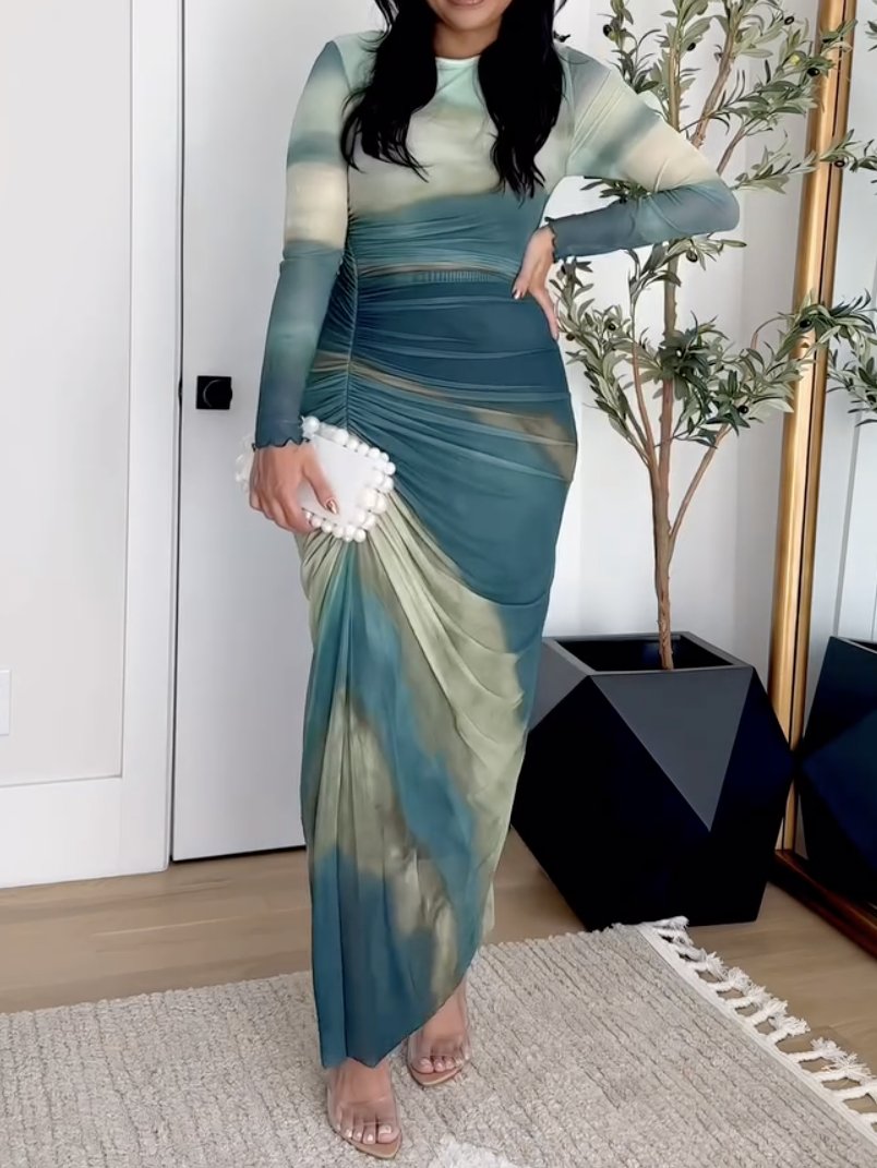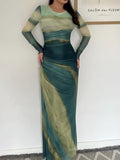 Sexy Long Sleeve O Neck Mesh Printed Ruffles Maxi Dress