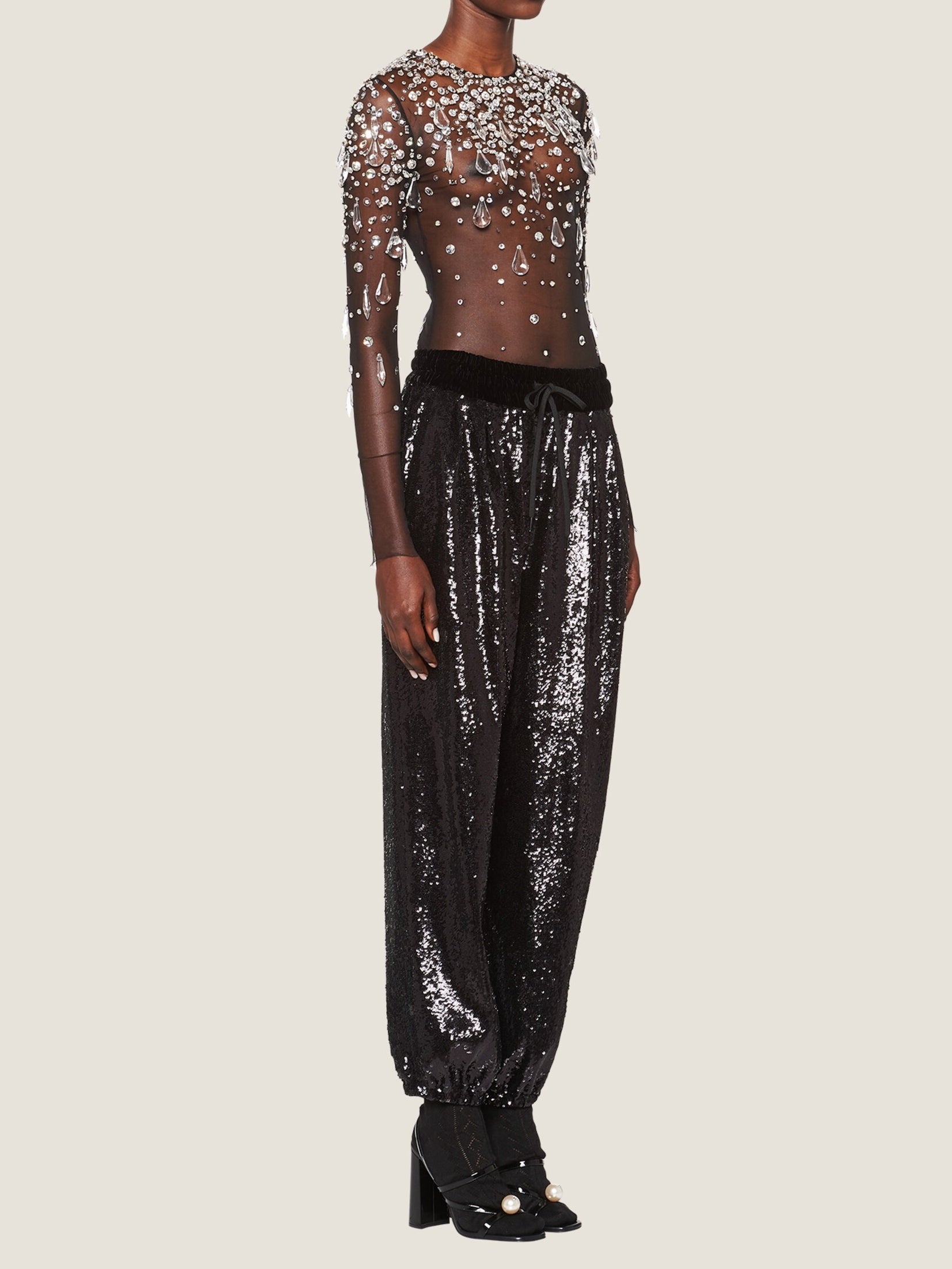 Be the center of attention in these gorgeous harem pants featured in a pull on style with elasticized waist and allover sequined detailing