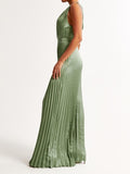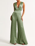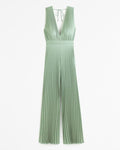Flattering jumpsuit in our elevated satin fabric, featuring a plunging v-neckline, tie-back detail and all-over pleating details. Imported.