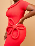 Mid weight ribbed jersey fabric. Fabric offers some stretch • sculptured fabric flower detail at the right side of the waist • chunky neckline • length of dress 45"• concealed rear zip fastenings • short sleeves