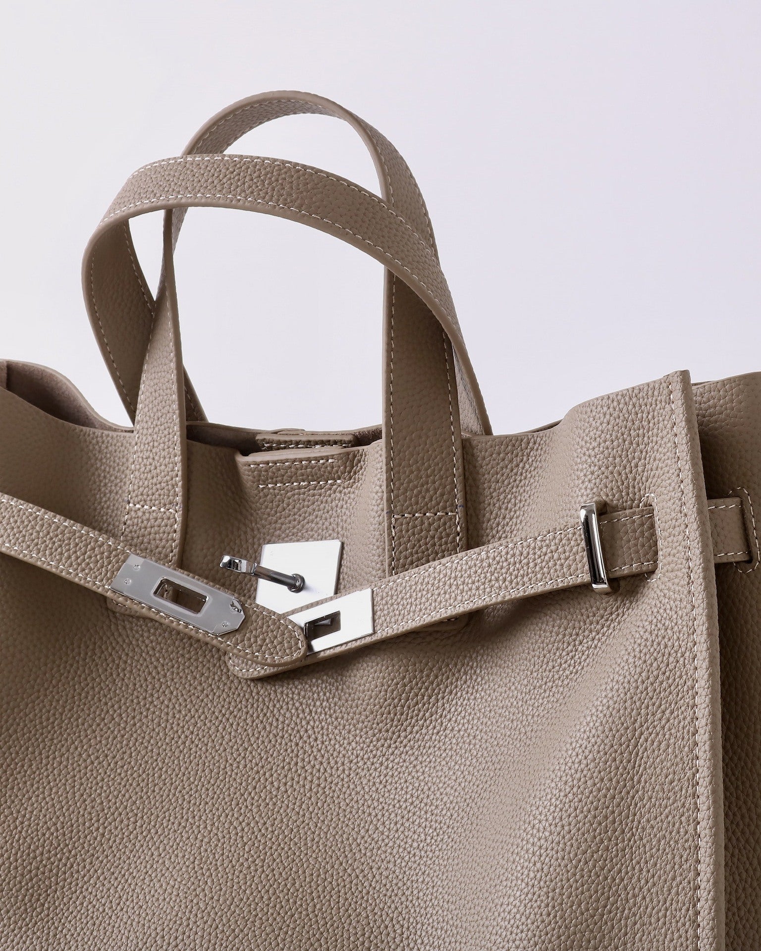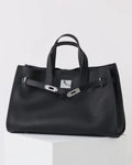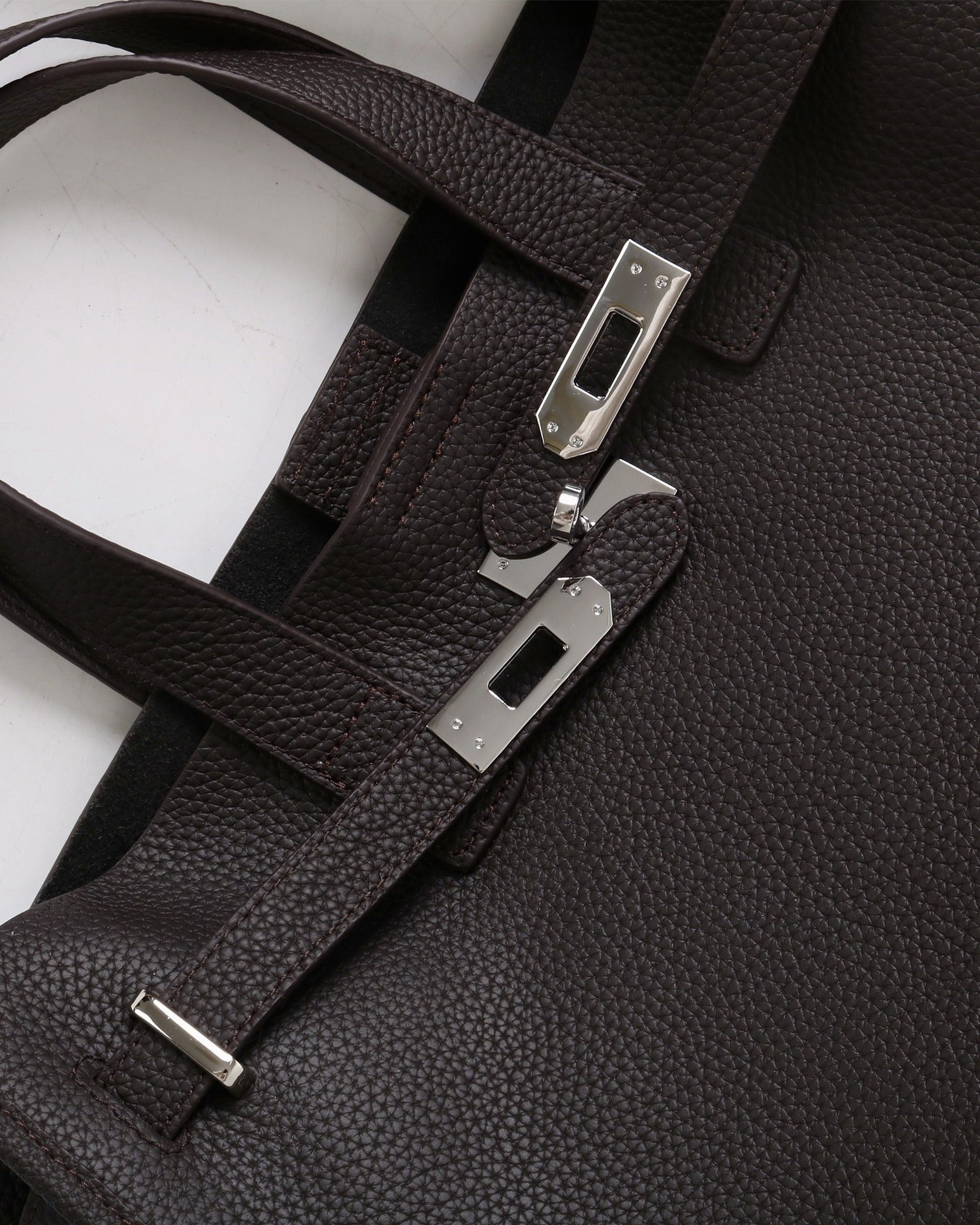• Description: Textured leather with soft curved handles, silver buckle for a chic accent, and comes with a small pouch and detachable strap