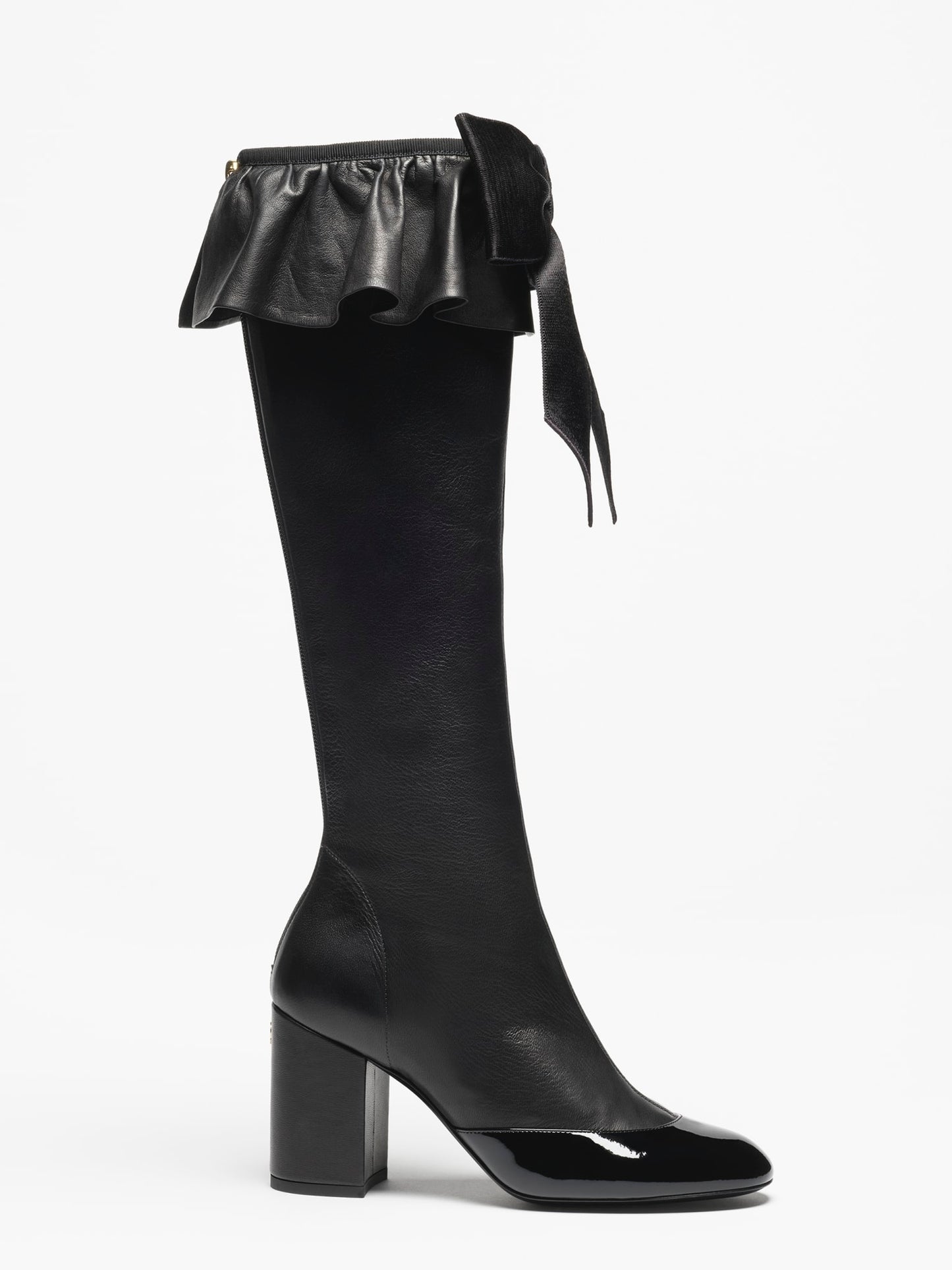 This lambskin leather boot is embellished with a graphic bow