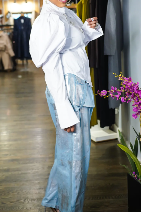 - This Denim button-down top is perfect for a sophisticated yet stylish look. With its cotton blend fabric, long puff sleeves, and elegant rhinestone buttons, it adds a touch of glamour to any outfit. Whether you're dressing up for a formal event or looking for a chic everyday piece, this solid top offers versatility and comfort. Pair it with tailored trousers for a polished look or with jeans for a more casual, yet put-together ensemble.