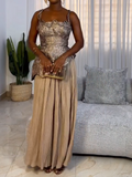 Elevate your look with this stunning two-piece set. The fitted top gracefully transitions from chest to waist into a spiral, asymmetric hemline—longer on one side toward the hip and shorter on the other near the waist. Thin straps with delicate cording details add a touch of elegance. Paired with a flowing accordion maxi skirt, this ensemble is perfect for making a sophisticated statement.