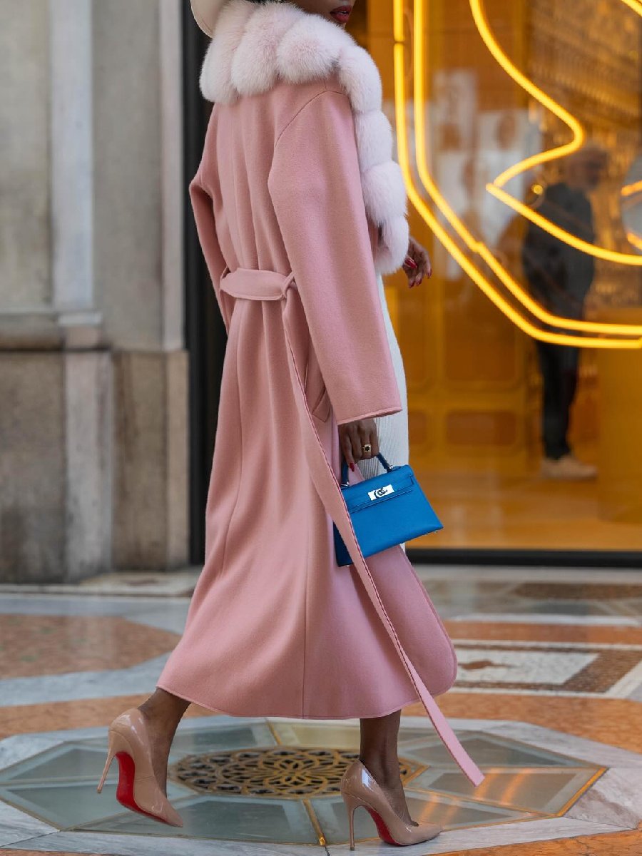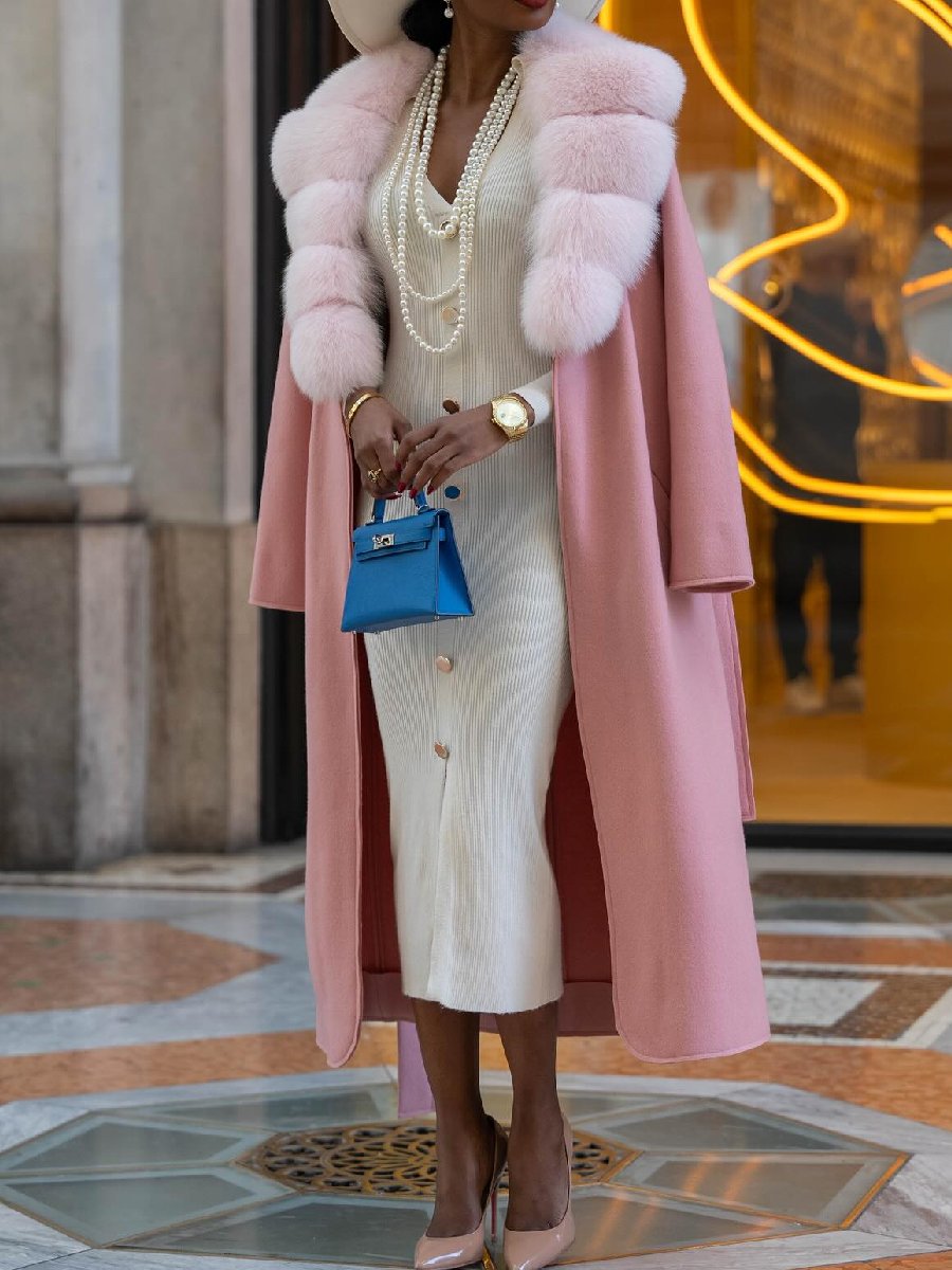 - This elegant piece features a generously oversized fox fur collar that adds a touch of opulence and warmth. The coat is fully lined for comfort, with discreet pockets and delicate stitching that ensures durability. Perfect for those who appreciate both style and sophistication, this coat is a statement piece that exudes timeless elegance.