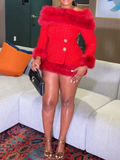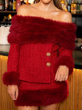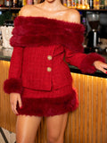 Tweed Fluffy Panel Off Shoulder Jacket Set