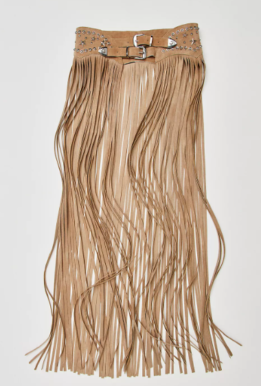 - Features: Adjustable style, wide silhouette, suede fabrication, stud detailing, maxi-length fringe at bottom