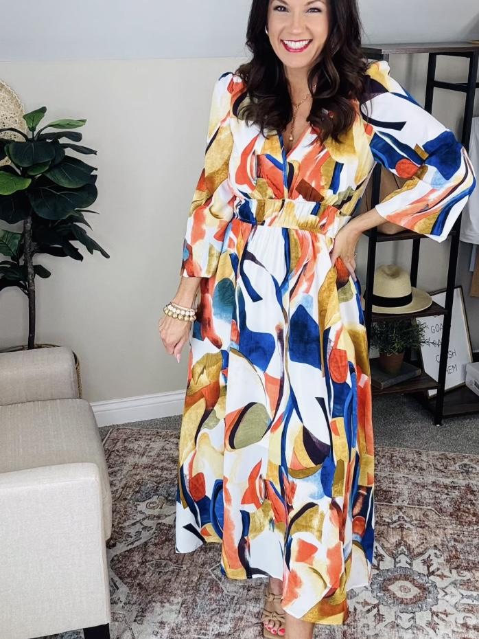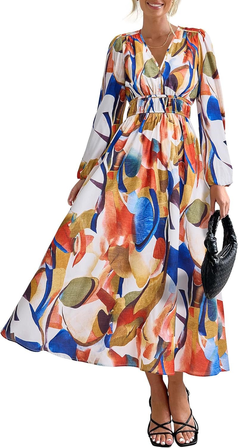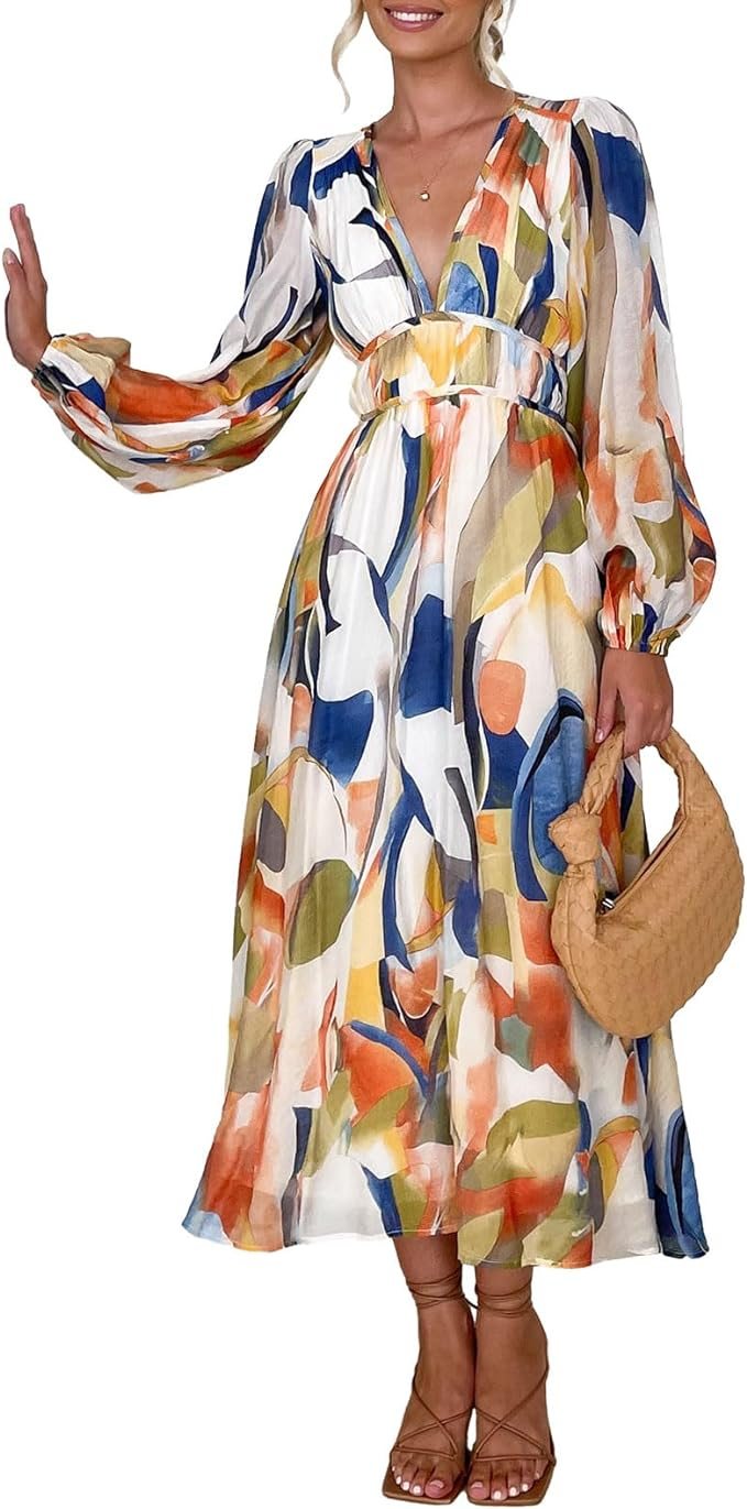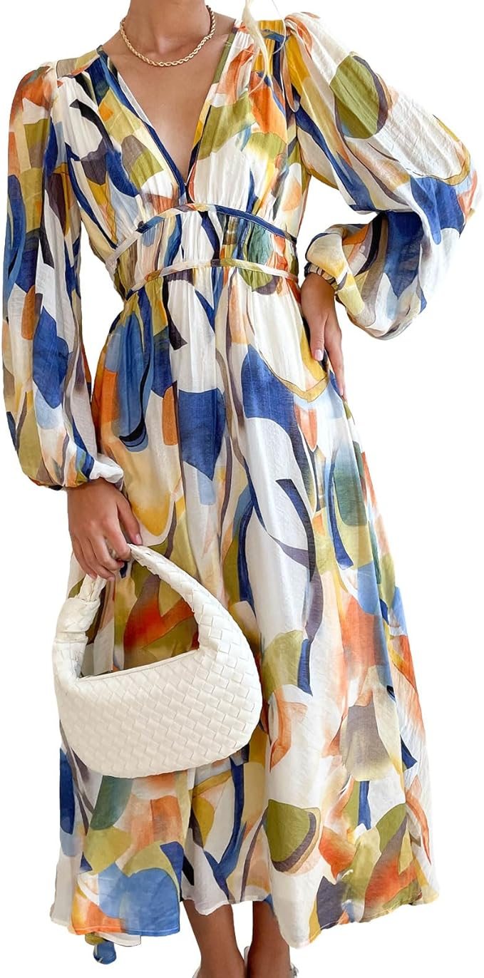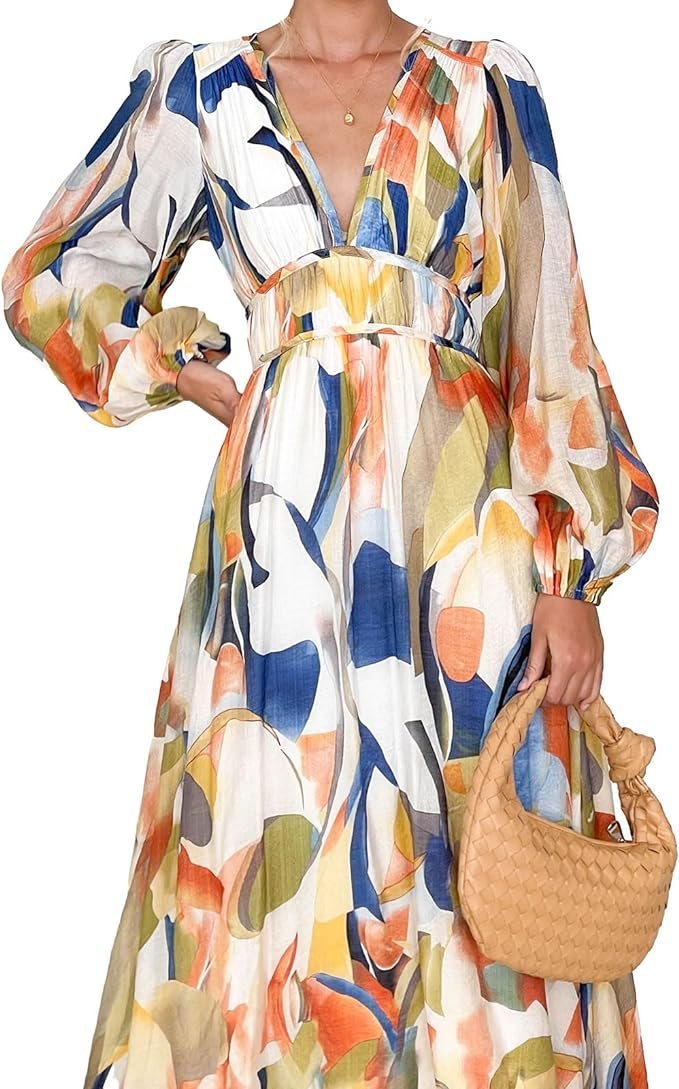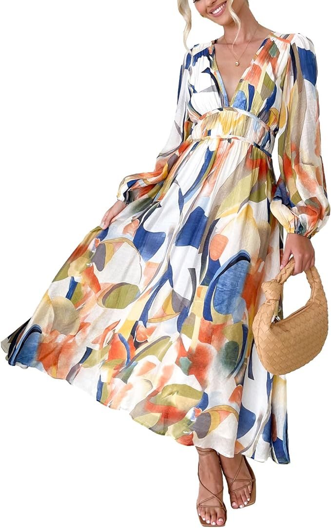 Women's 2024 Spring Boho Long Dress Casual Long Sleeve V-Neck Print