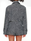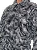 A woven Jacket Suit featuring an allover chevron pattern, chest flap pockets, long sleeves, and a basic collar.