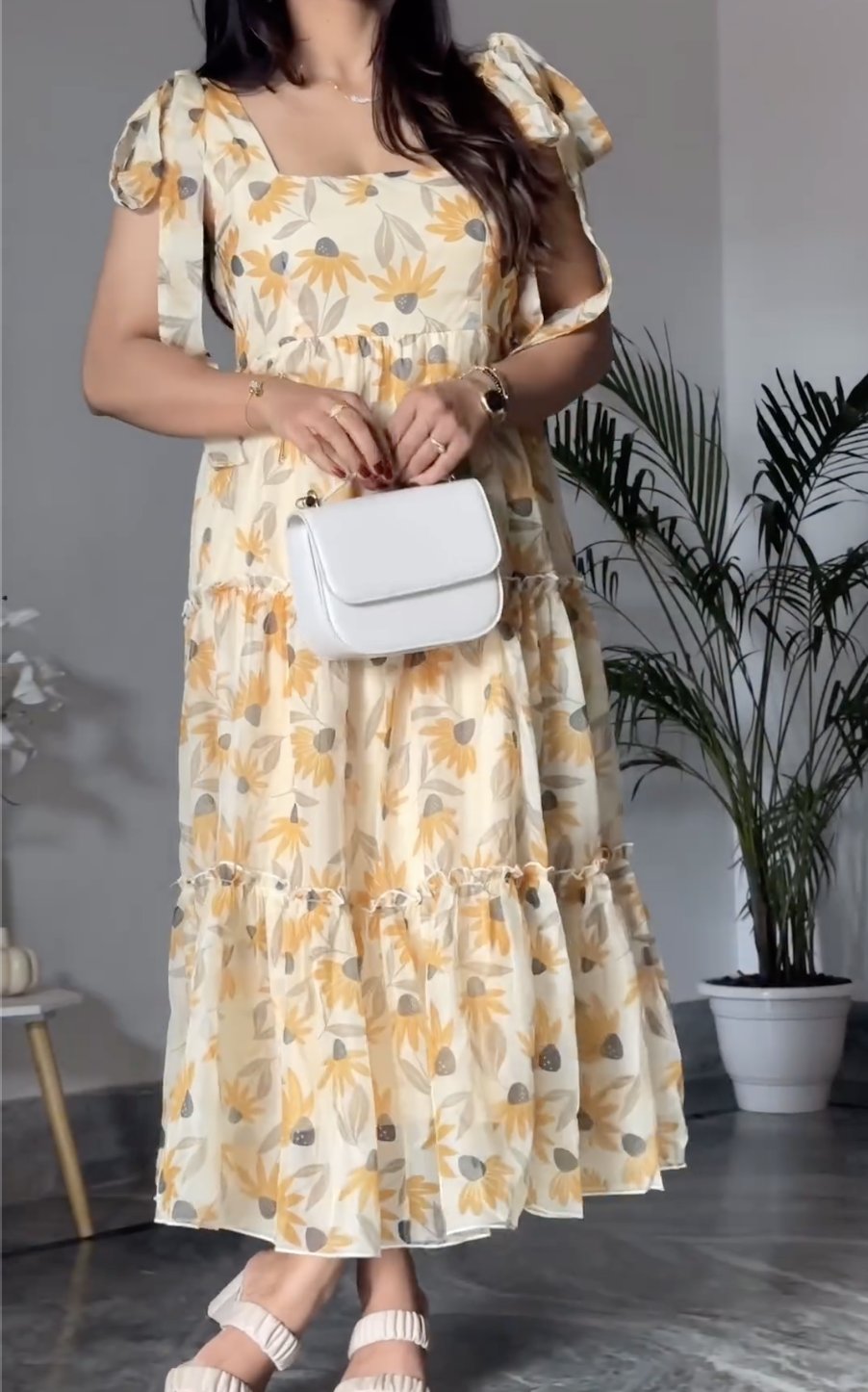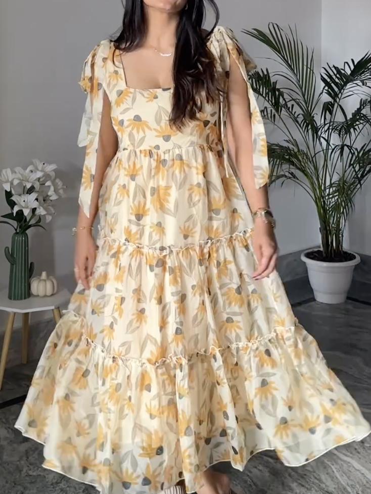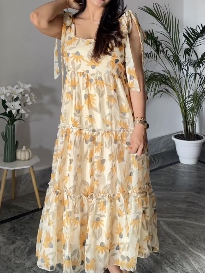 Yellow Block Print Tiered Dress